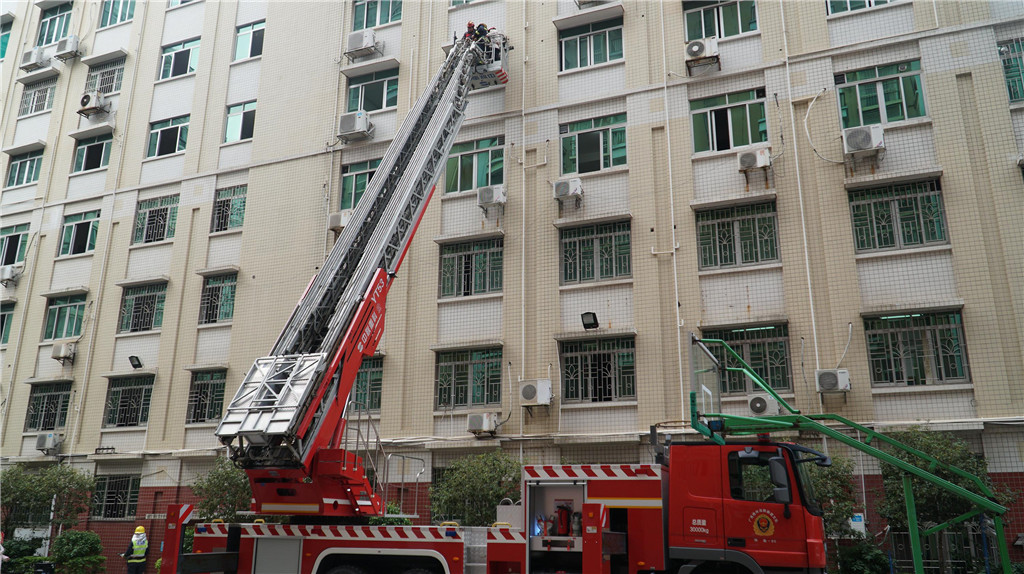 5楼消防出口已被大火封锁,有2名职工被困5楼某办公室,请求消防救援人员云梯救人。