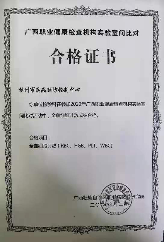 梧州市疾病预防控制中心获取2020年广西职业健康检查机构质量控制合格证书