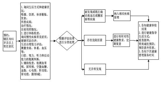 (一)生活方式和健康状况评估。通过问诊及老年人健康状态自评了解其基本健康状况、体育锻炼、饮食、吸烟、饮酒、慢性疾病常见症状、既往所患疾病、治疗及目前用药和生活自理能力等情况。
