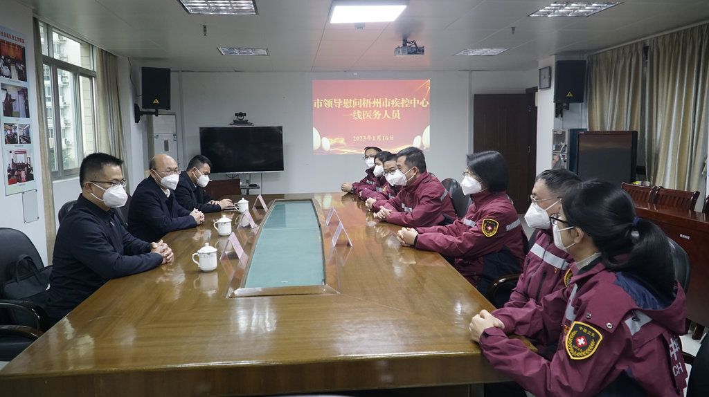 1月16日上午,梧州市副市长李广勇一行到梧州市疾病预防控制中心看望慰问一线医务人员代表,向他们致以新年的问候和祝福,送上党委和政府的关怀和温暖。