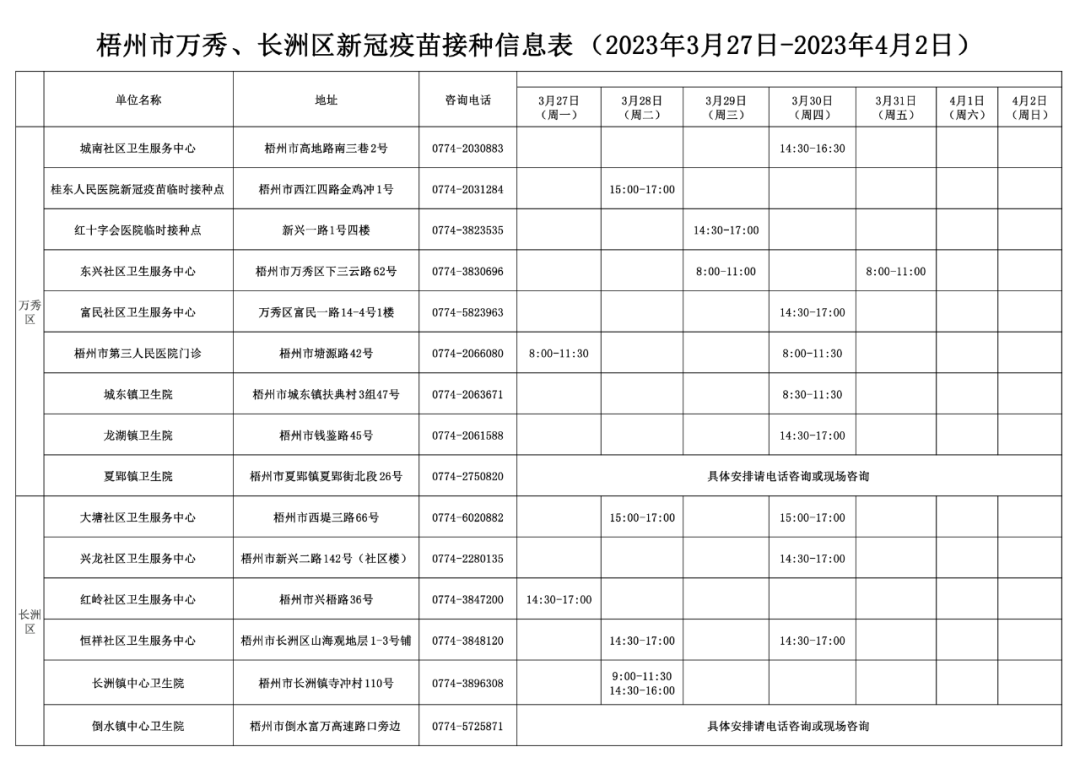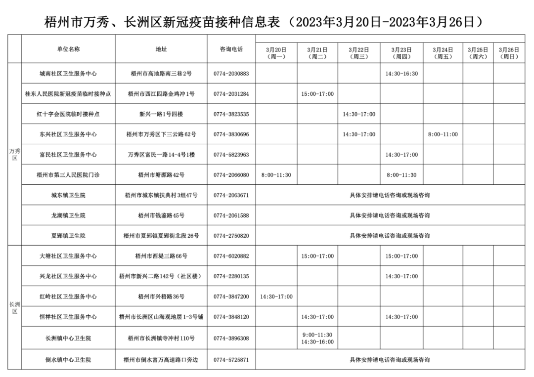 梧州市万秀、长洲区新冠疫苗接种安排(2023年3月20日—2023年4月2日)