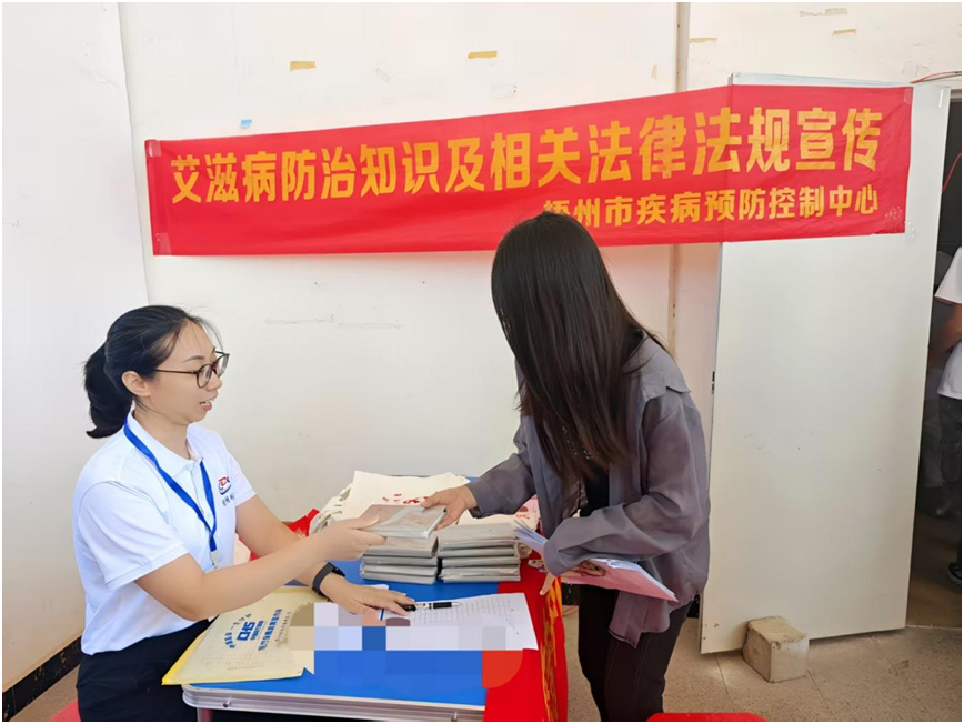 梧州职业学院学生正在领取防艾宣传礼品