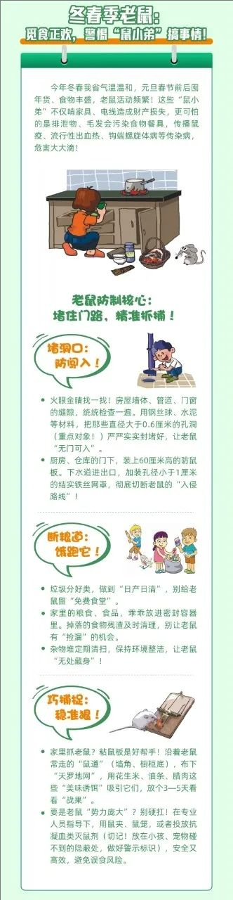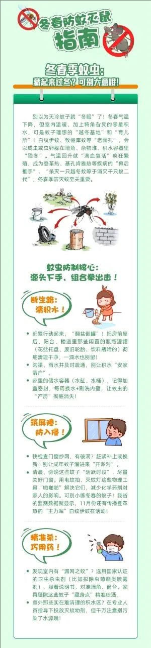 冬季是防控越冬蚊、减少来年蚊媒疾病的关键窗口期。请利用晴好天气,对家庭内外、楼道、地下室、车库、庭院阳台等进行彻底清扫,重点清除各类积水容器、废弃轮胎、花盆托盘等处的残余积水,翻盆倒罐。同时,清理杂物堆,封堵管道、墙洞缝隙,消除老鼠、蟑螂等病媒生物的孳生与藏匿环境。妥善储存食物,做到垃圾密闭、日产日清。请养成良好个人卫生习惯,勤洗手、常通风,根据实际情况科学佩戴口罩,加强锻炼,增强体质。