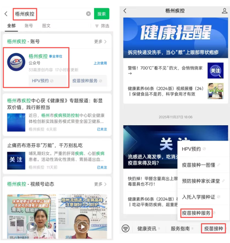 第1步:在微信中搜索“梧州疾控”微信公众号,点击“疫苗接种”→“疫苗接种服务”。
