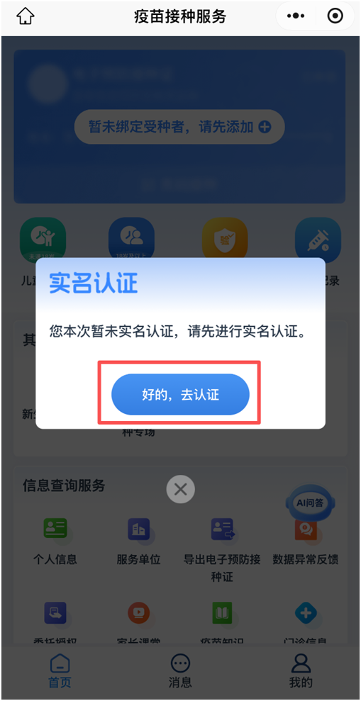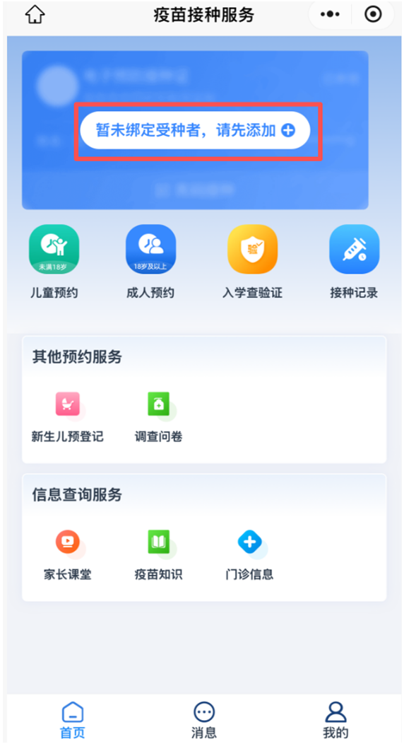 第4步:在首页点击“暂未绑定受种者,请先添加”。