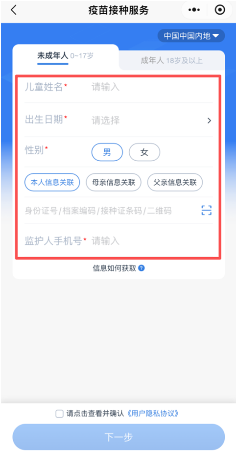 第5步:根据需要绑定的受种人的身份,选择“未成年人”或“成年人”。依次填写相关信息、查看并确认《用户隐私协议》,完成后点击“下一步”。