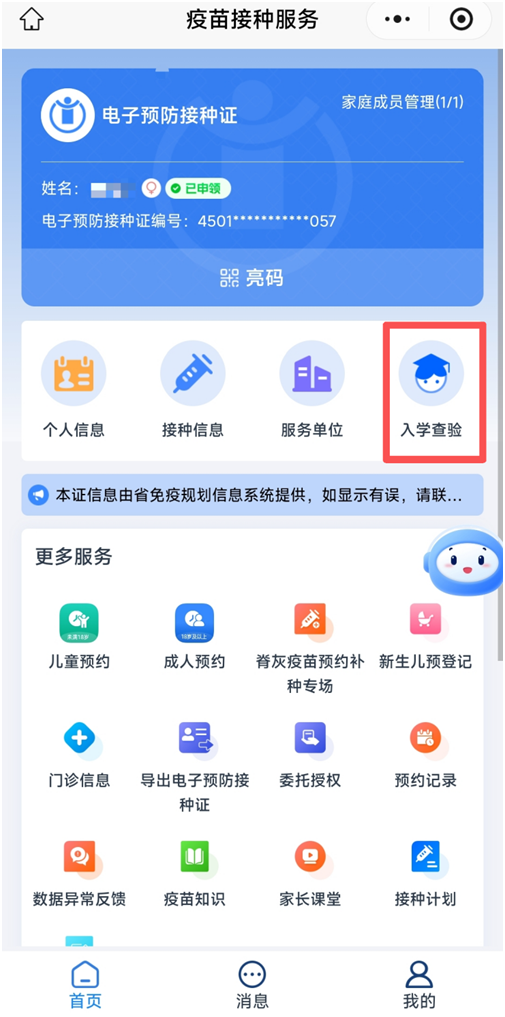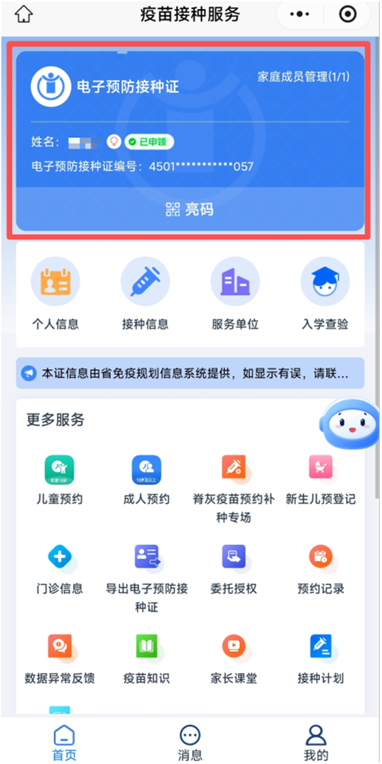 广西电子预防接种证与纸质版预防接种证具有同等法律效力,它依托广西免疫规划信息系统,通过“梧州疾控”微信公众号,可安全、便捷地记录和展示受种者的疫苗接种信息,解决了传统纸质预防接种证携带不便、容易丢失等问题。注册申领电子预防接种证后可实现亮码接种、查看个人基本信息、接种记录、预约接种、接种门诊信息、儿童入托入学查验等功能。