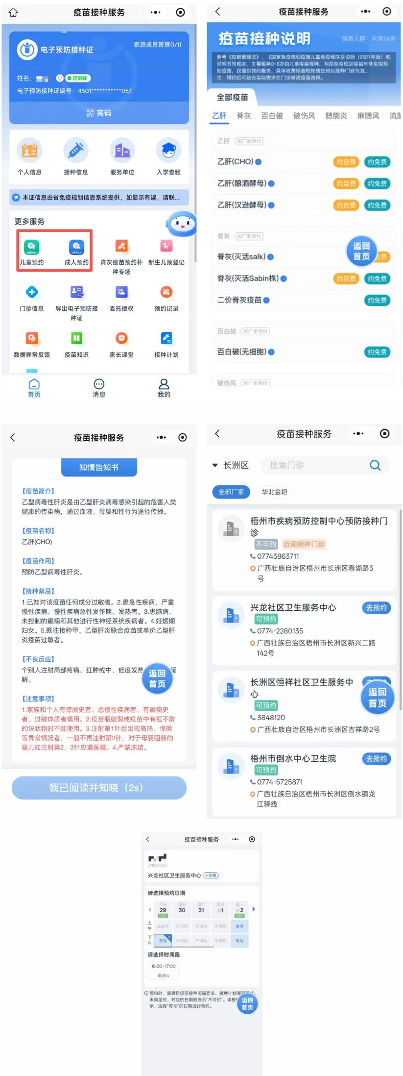 选择“儿童预约/成人预约”—选择需要预约的“疫苗种类”—查看知情告知书—选择“接种单位”—选择“日期时间”,完成疫苗预约。