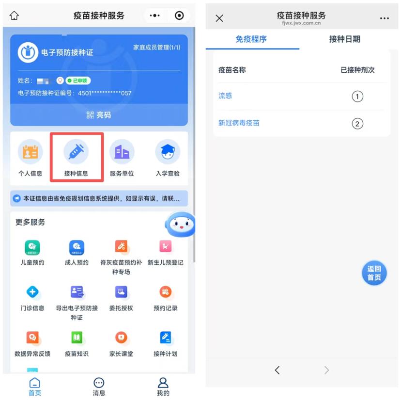 建有预防接种档案并绑定的受种者,点击“接种信息”即可自助查询疫苗接种记录信息,包括疫苗名称、接种剂次、疫苗生产企业和接种日期等。