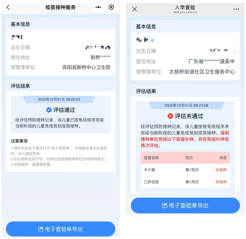 其中“评估通过”显示“经评估预防接种记录,该儿童已按照免疫程序完成当前阶段的儿童免疫规划疫苗接种”,当前无需再接种;“评估未通过”显示“经评估预防接种记录,该儿童按照免疫程序未完成当前阶段的儿童免疫规划疫苗接种,请到接种单位完成以下疫苗补种,并在完成补种后再次评估”。同时在下方显示需要补种的疫苗信息,包括疫苗名称、剂次和推荐补种的时间。