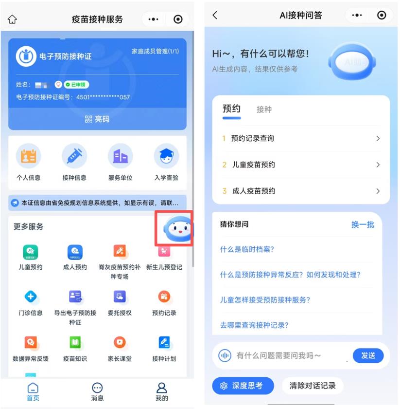 “AI接种问答”智能助手可根据受种者提问,通过AI智能检索,快速提供疫苗种类查询、接种时间、接种单位、接种注意事项等疫苗接种相关问题咨询答案,为受种者提供精准、贴心的服务体验。