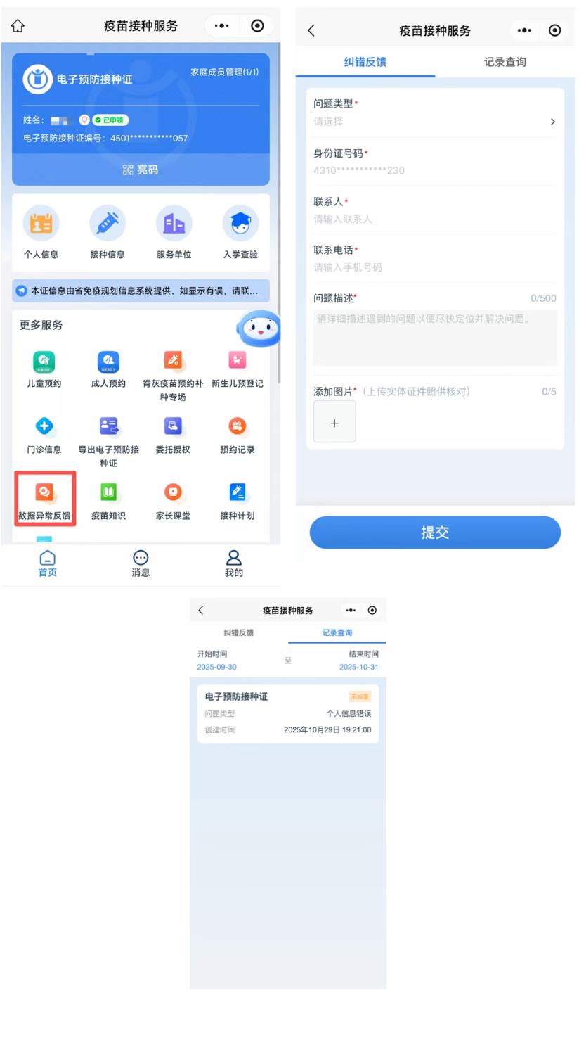 受种者个人基本信息、疫苗接种记录等信息如存在错误与实际不符,可点击“数据异常反馈”,选择信息错误的类型,填写错误信息内容的描述、上传错误信息的图片,并填写联系人及联系电话后进行提交反馈,工作人员核实信息后进行回复反馈。点击“记录查询”可按具体时间段过滤查询受种者提交的数据异常反馈。