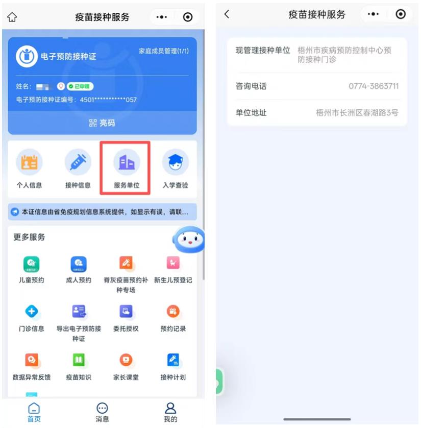 如果您在使用“梧州疾控-疫苗接种服务”时,遇到需要修改个人信息、无法绑定档案、未能申领等情况,可以点击“服务单位”,拨打现管理接种单位的咨询电话进行咨询。