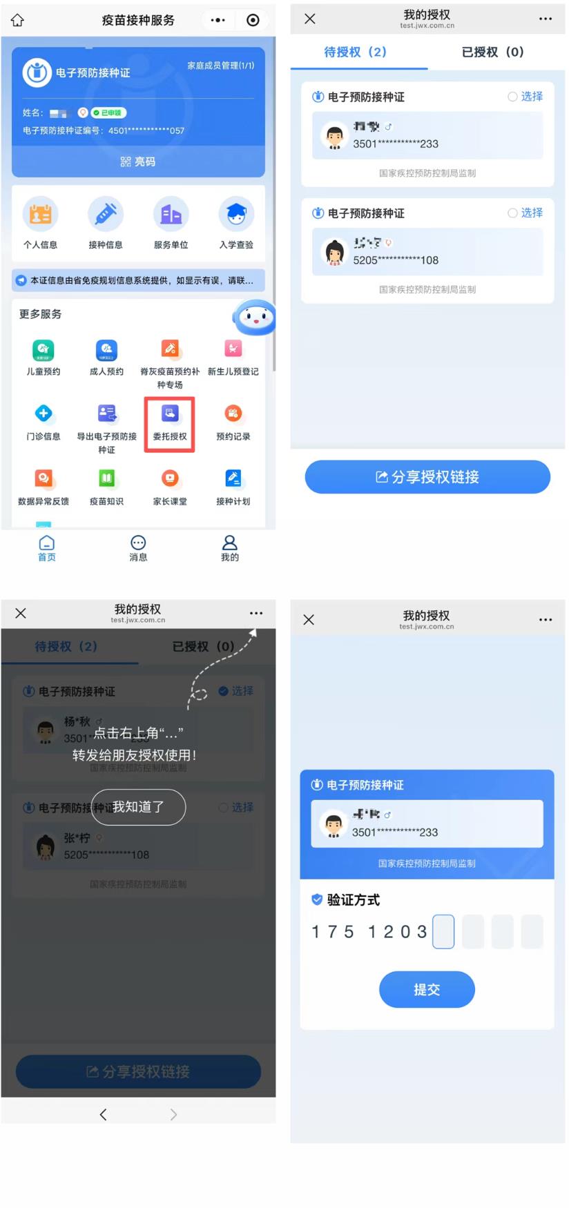 儿童监护人可借助“委托授权”功能,将已申领的电子预防接种证通过生成分享链接或二维码等方式,进行委托儿童临时监护人(如孩子爷爷、奶奶或学校老师等),携带儿童接种疫苗时进行亮码接种。