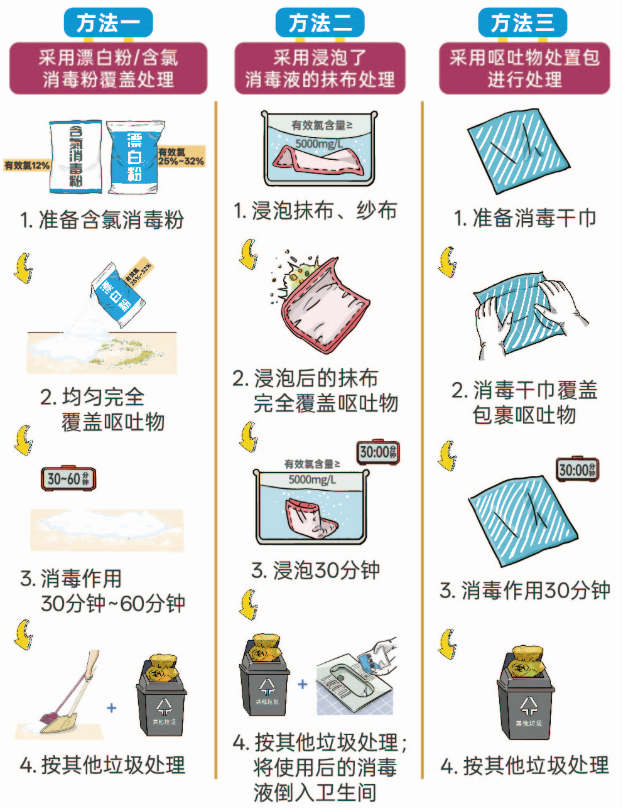 1.发生在马桶或便池上的呕吐物,需进行覆盖消毒后再冲洗;