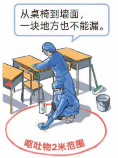呕吐场所:使用≥1000mg/L含氯消毒液,对呕吐物周围2米范围内的地面、桌椅、门把手等高频接触部位进行擦拭消毒。