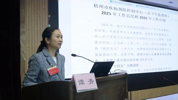 中心(所)党支部书记谭青作《梧市疾控中心(市卫监所)2025年工作总结及2026年工作计划》报告。谭青指出全体职工在中心(所)党支部和中心(所)班子的带领下,以习近平新时代中国特色社会主义思想为指导,深入贯彻全国、全区疾控工作会议及梧州市卫生健康工作部署,紧扣“健康梧州”建设主线,锚定疾控体系改革与卫监执法提质核心目标,统筹推进各项疾控(卫监)工作,荣获“全国卫生健康系统先进集体”荣誉称号。