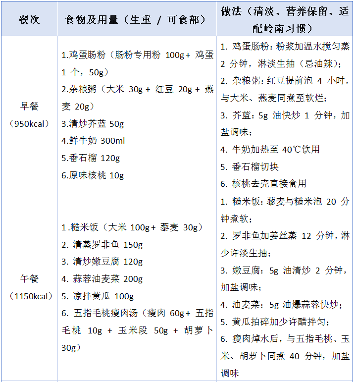 结合岭南特色,我们以体重60千克、轻度身体活动水平的HIV无症状期成年人为例,定制了这份一日营养食谱,照着吃很省心~